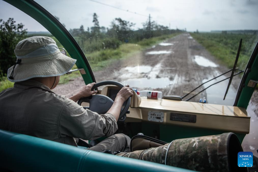 Engineer Zhang Yuming is pictured on his way to an observation site at Shishou Milu Deer National Nature Reserve in central China's Hubei Province, Aug. 2, 2023. (Xinhua/Wu Zhizun)