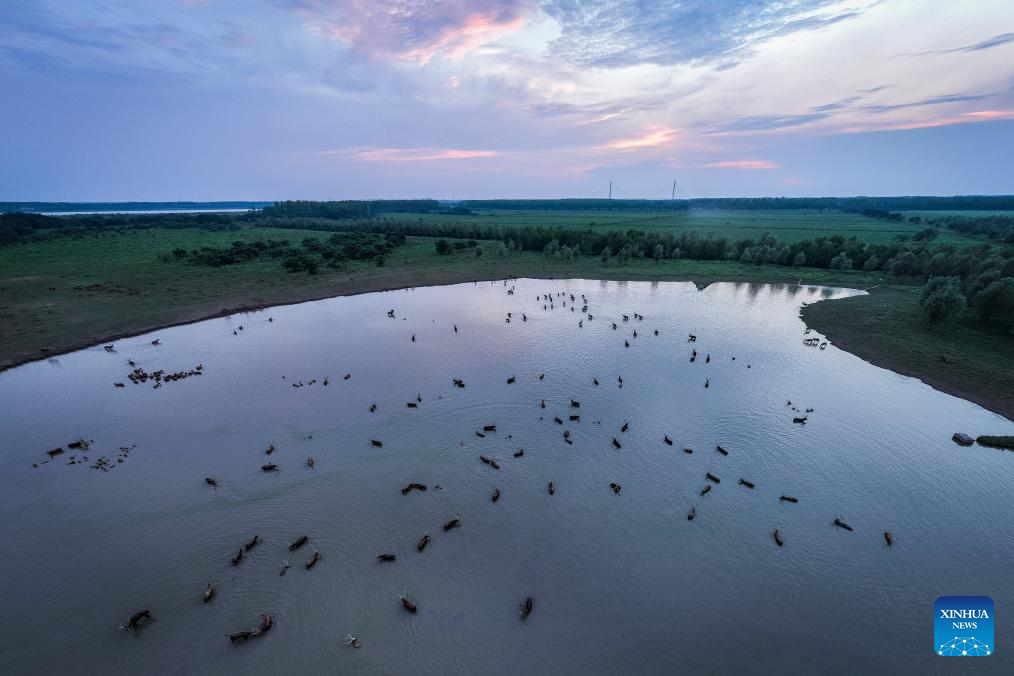 This aerial photo taken on July 31, 2023 shows milu deer at Shishou Milu Deer National Nature Reserve in central China's Hubei Province. (Xinhua/Wu Zhizun)