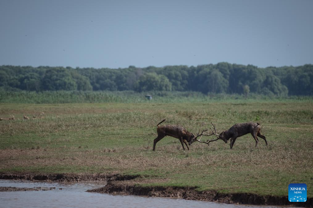 Two male milu deer fight at Shishou Milu Deer National Nature Reserve in central China's Hubei Province, Aug. 1, 2023. (Xinhua/Wu Zhizun)