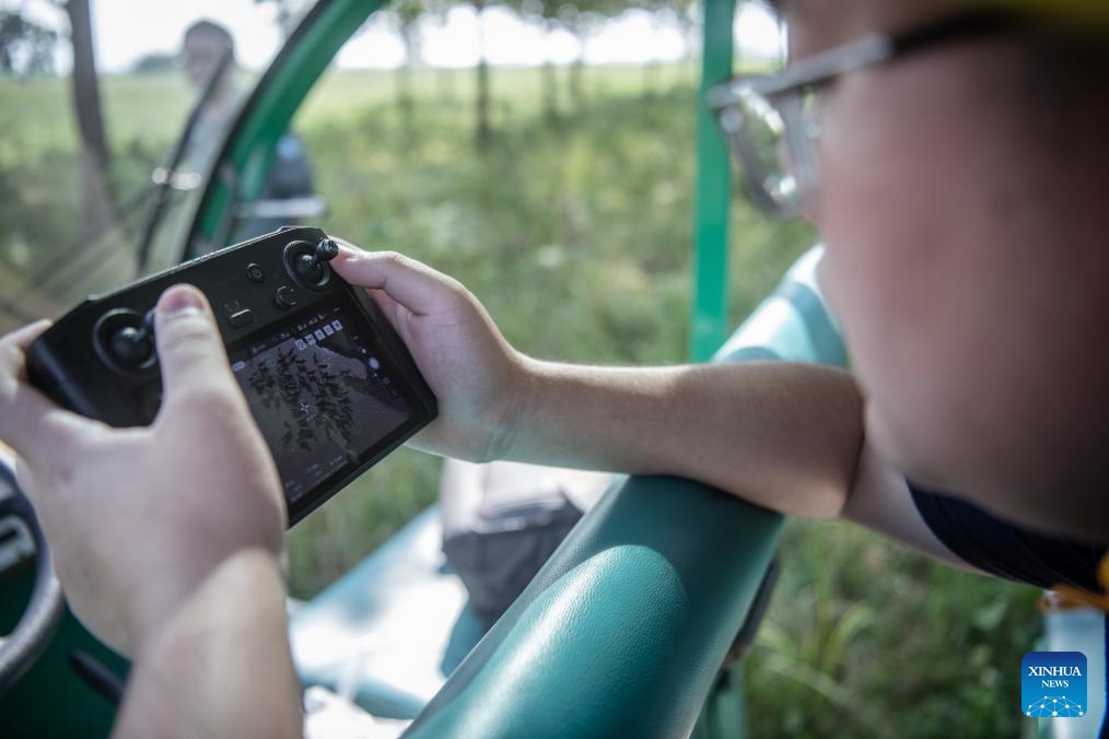 Technician Ge Xianmei observes milu deer via a drone at Shishou Milu Deer National Nature Reserve in central China's Hubei Province, Aug. 1, 2023. (Xinhua/Wu Zhizun)