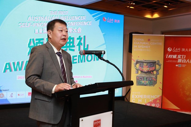 Zhou Limin, Consul General of the People's Republic of China in Sydney, delivers a speech at the first Australian Influencer Self-Promotion Conference at the Sydney China Cultural Center in Sydney, Australia, July 31, 2023. (Photo/Ji He)
