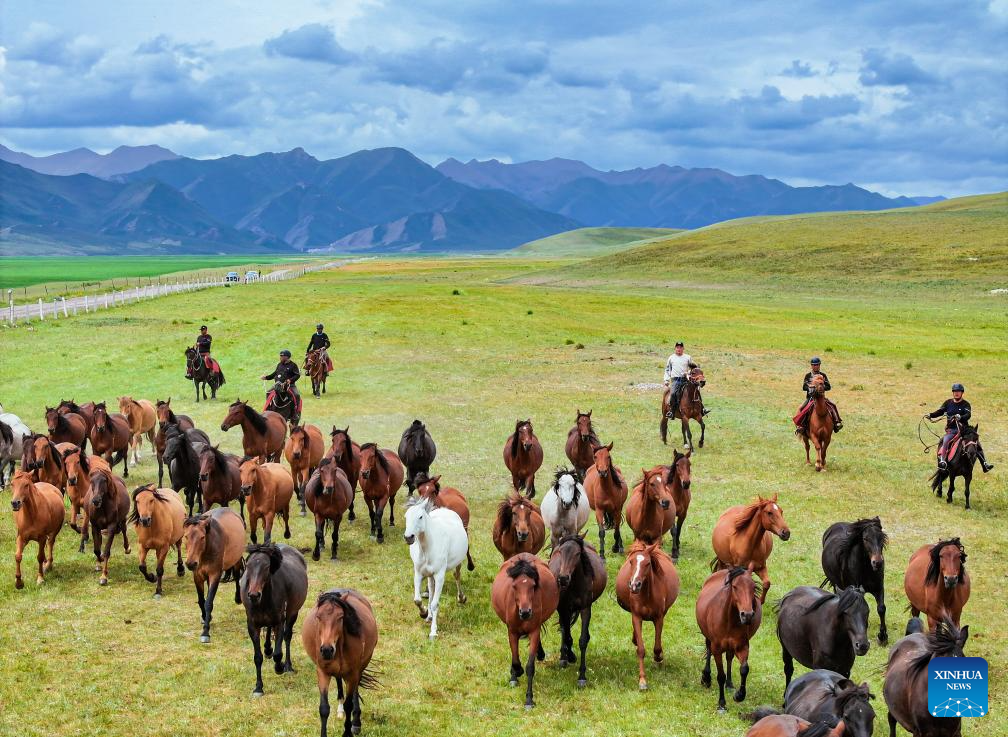 This photo taken on Aug. 6, 2023 shows Shandan horses at the Shandan Horse Breeding Farm in Shandan County, Zhangye City, northwest China's Gansu Province. Lying at the foothill of the Qilian Mountains, the Shandan Horse Breeding Farm has a history of over 2,000 years and now serves as a major horse breeding facility in China. Shandan horse, a species exclusively bred by the farm, boasts physical fitness and good endurance. (Xinhua/Fan Peishen)