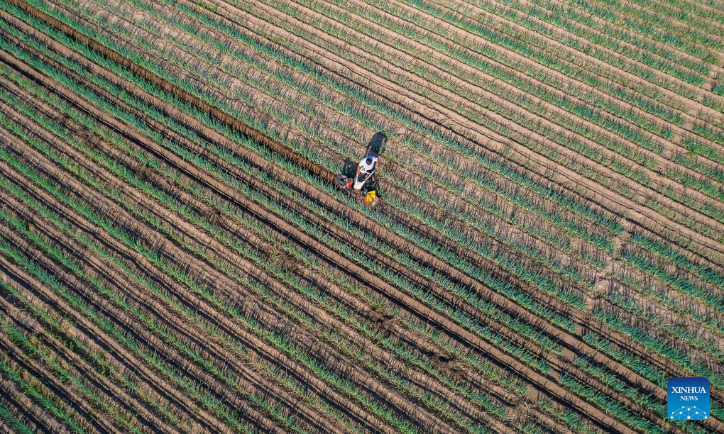 This aerial photo taken on Aug. 7, 2023 shows a farmer working in a scallion field in Huiting Township, Xiayi County, central China's Henan Province. Tuesday marks "Liqiu", or the beginning of autumn, the first day of autumn on the Chinese lunar calendar. Farmers in different areas of the country are busy with harvesting. (Photo by Wang Gaochao/Xinhua)