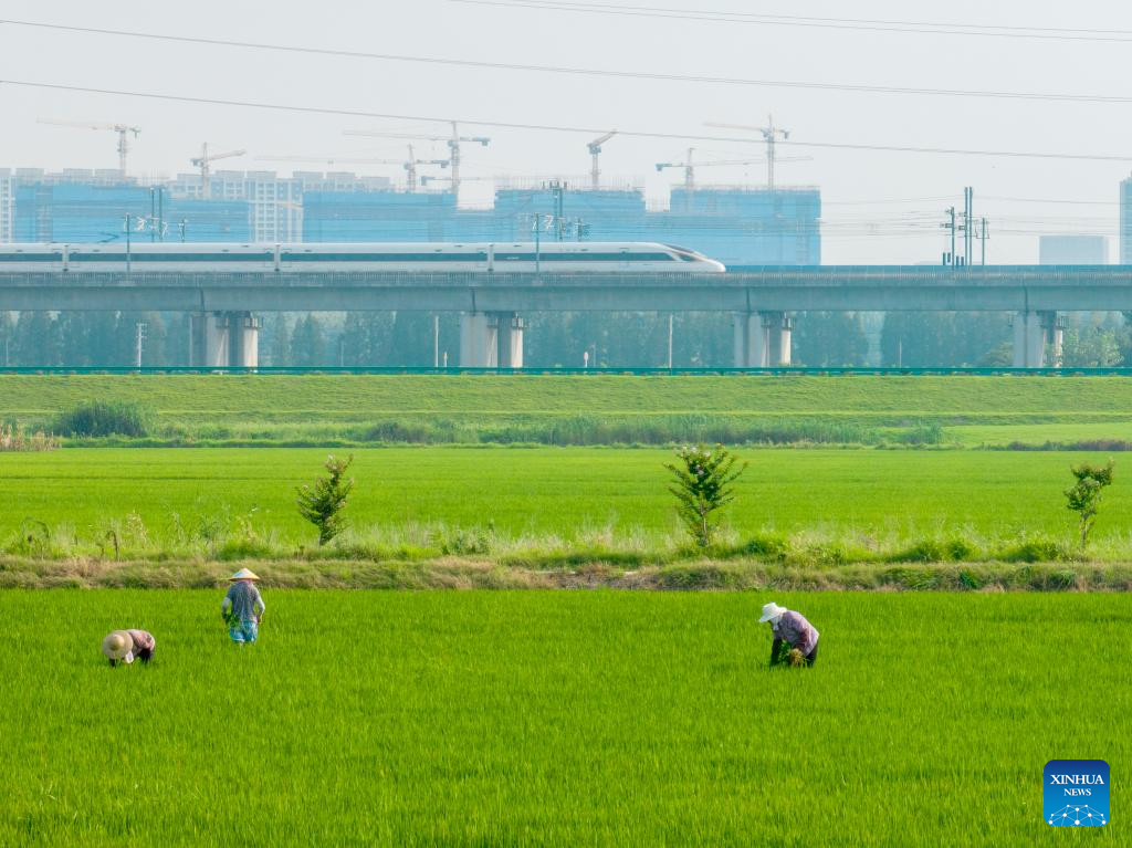 This aerial photo taken on Aug. 7, 2023 shows farmers weeding a paddy field of a modern agricultural park in Kunshan City, east China's Jiangsu Province. Tuesday marks "Liqiu", or the beginning of autumn, the first day of autumn on the Chinese lunar calendar. Farmers in different areas of the country are busy with harvesting. (Photo by Wang Xuzhong/Xinhua)