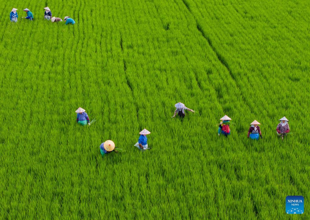 This aerial photo taken on Aug. 7, 2023 shows farmers weeding a paddy field in Nanjing, capital of east China's Jiangsu Province. Tuesday marks "Liqiu", or the beginning of autumn, the first day of autumn on the Chinese lunar calendar. Farmers in different areas of the country are busy with harvesting. (Photo by Du Yi/Xinhua)