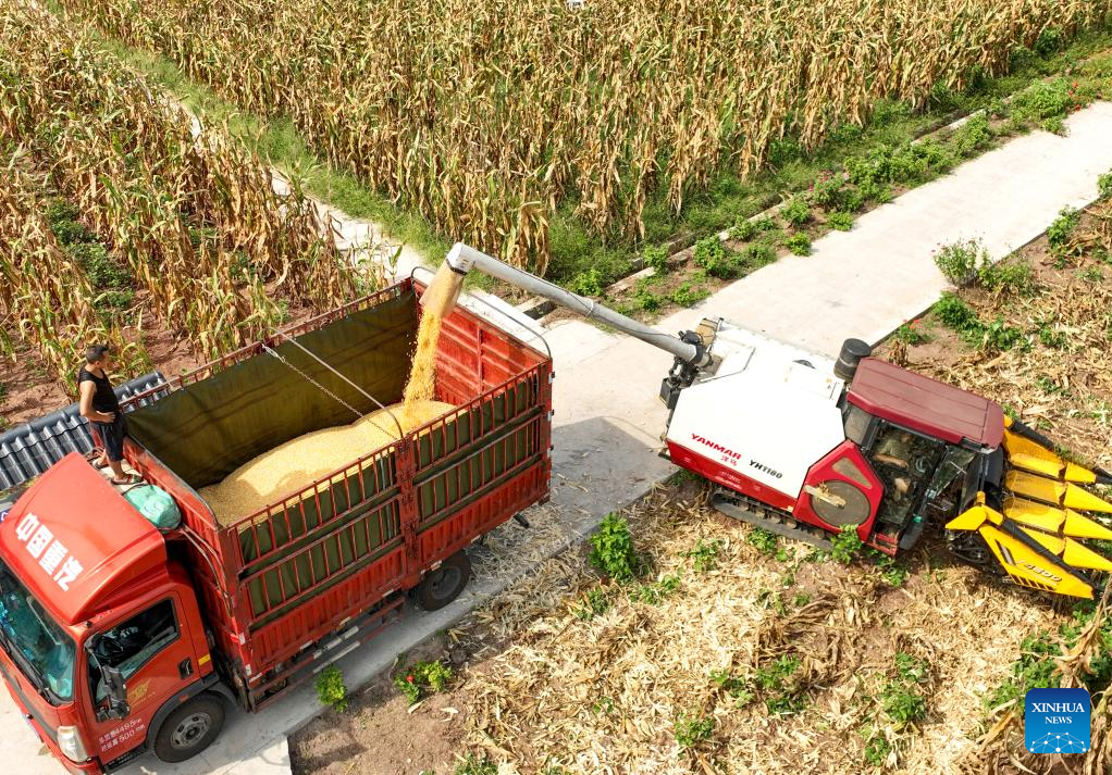 A harvester harvests corn at a farmland in Yongxing Township, Huaying City, southwest China's Sichuan Province, Aug. 6, 2023. Tuesday marks "Liqiu", or the beginning of autumn, the first day of autumn on the Chinese lunar calendar. Farmers in different areas of the country are busy with harvesting. (Photo by Qiu Haiying/Xinhua)