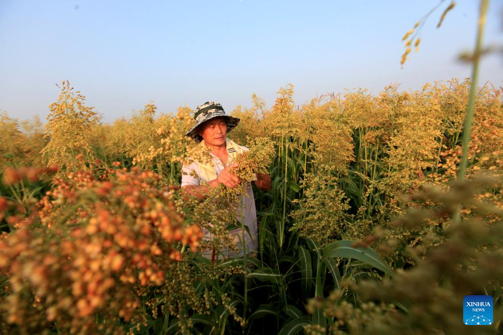 A farmer works in a sorghum field in Pingyi County of Linyi City, east China's Shandong Province, Aug. 7, 2023. Tuesday marks "Liqiu", or the beginning of autumn, the first day of autumn on the Chinese lunar calendar. Farmers in different areas of the country are busy with harvesting. (Photo by Wu Jiquan/Xinhua)