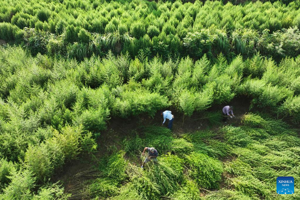 This aerial photo taken on Aug. 7, 2023 shows farmers working in an oil sunflower field in Wenxian County of Jiaozuo City, central China's Henan Province. Tuesday marks "Liqiu", or the beginning of autumn, the first day of autumn on the Chinese lunar calendar. Farmers in different areas of the country are busy with harvesting. (Photo by Xu Hongxing/Xinhua)
