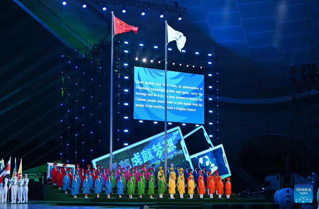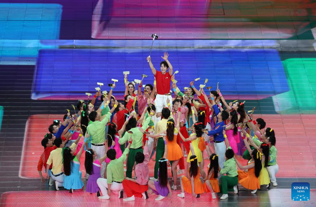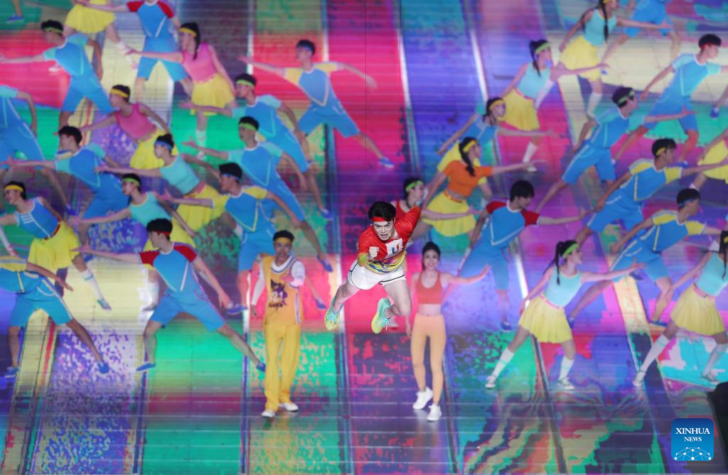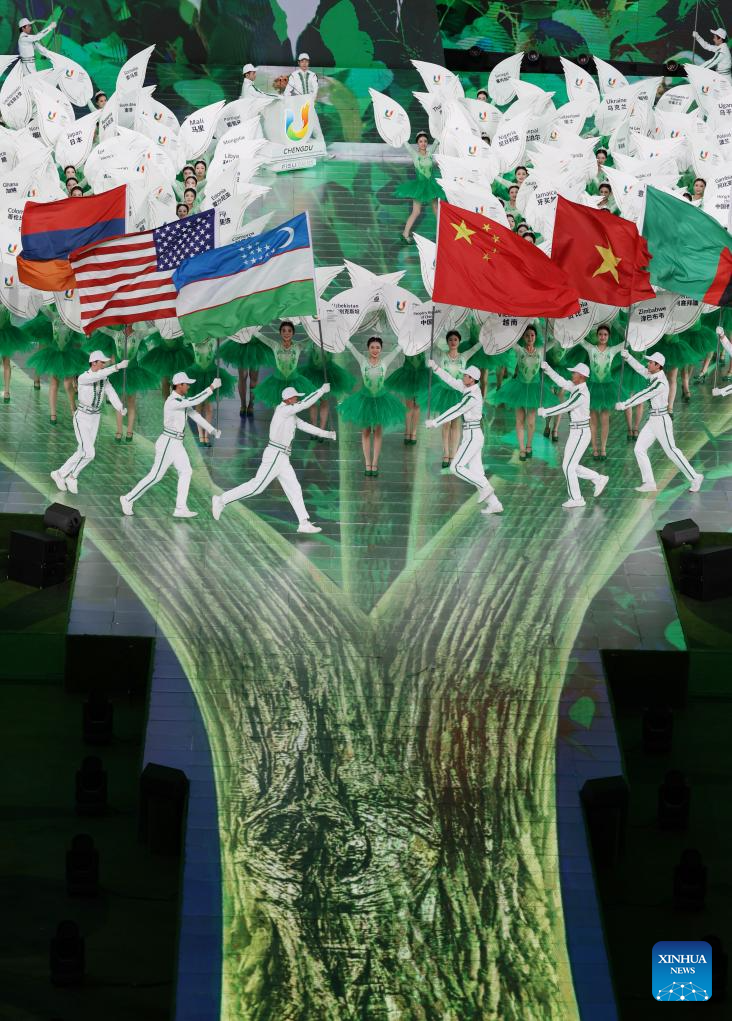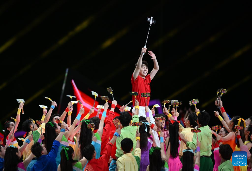 Artists are seen in a performance during the closing ceremony of the 31st FISU Summer World University Games in Chengdu, southwest China's Sichuan Province, Aug. 8, 2023. (Xinhua/Zhang Long)