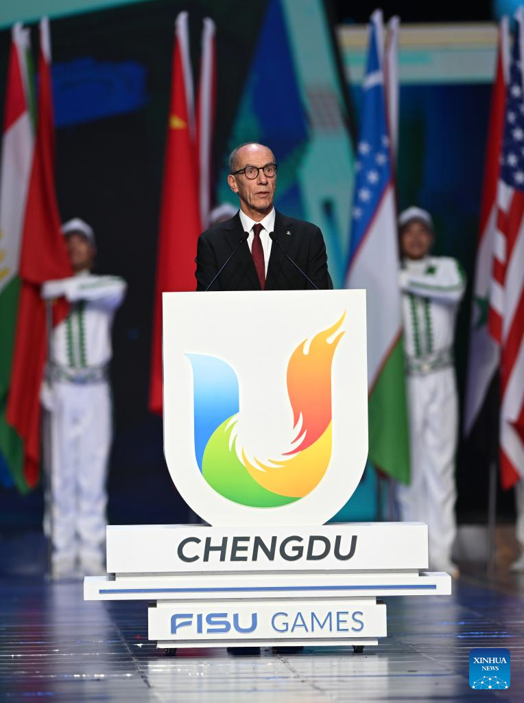 The FISU Acting President Leonz Eder delivers a speech during the closing ceremony of the 31st FISU Summer World University Games in Chengdu, southwest China's Sichuan Province, Aug. 8, 2023. (Xinhua/Zhang Long)