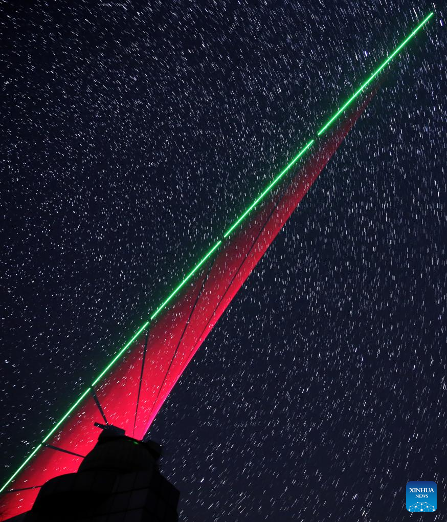 This composite photo taken on Dec. 9, 2016 shows a satellite-to-earth link established between quantum satellite "Micius" and the quantum teleportation experiment platform in Ali, southwest China's Tibet Autonomous Region. (Xinhua/Jin Liwang)