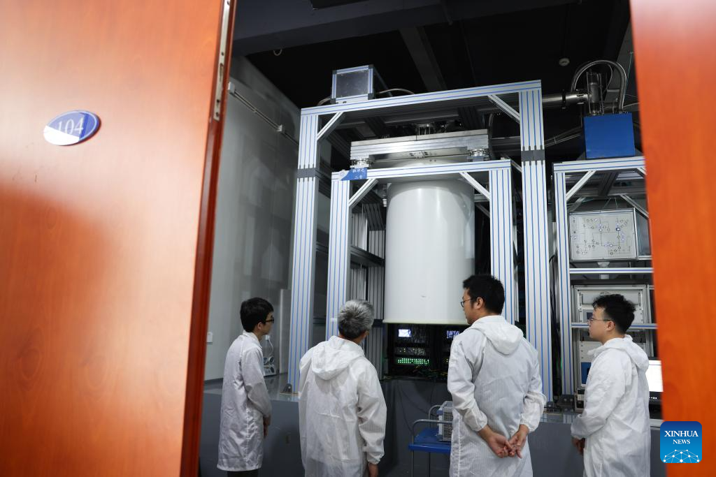 Peng Chengzhi (2nd L) and his colleagues talk about their research in front of the Zuchongzhi 2, a 66-qubit programmable quantum computing system, in Shanghai Research Center for Quantum Science in east China's Shanghai, July 22, 2023. (Xinhua/Qian Yi)