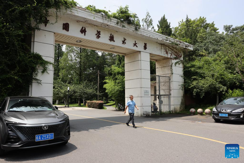 Peng Chengzhi walks out of the gate of the University of Science and Technology of China in Hefei, east China's Anhui Province, July 21, 2023. (Xinhua/Jin Liwang)