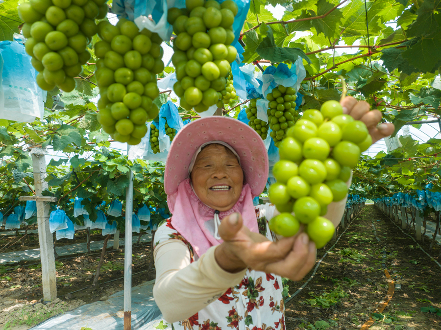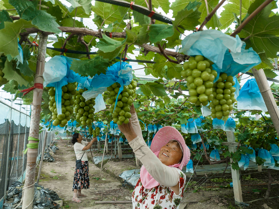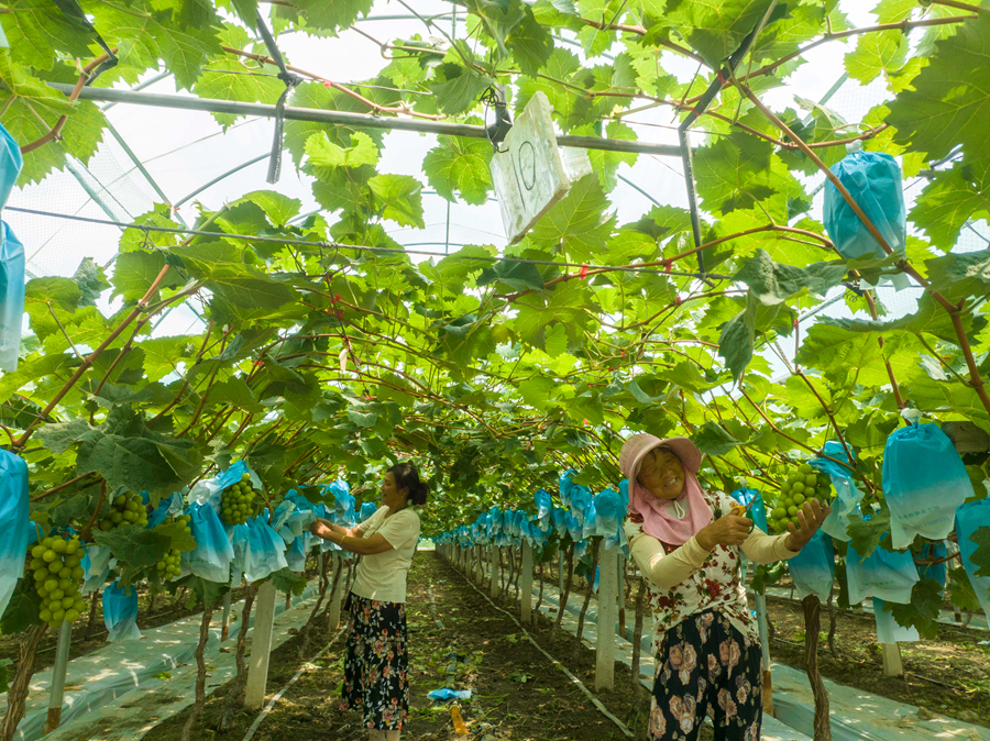 Home to 2,813 mu of grape greenhouses and 76 family farms, the township has gradually developed a comprehensive tourist attraction integrating grape picking experiences, leisure and sightseeing, increasing villagers' incomes.