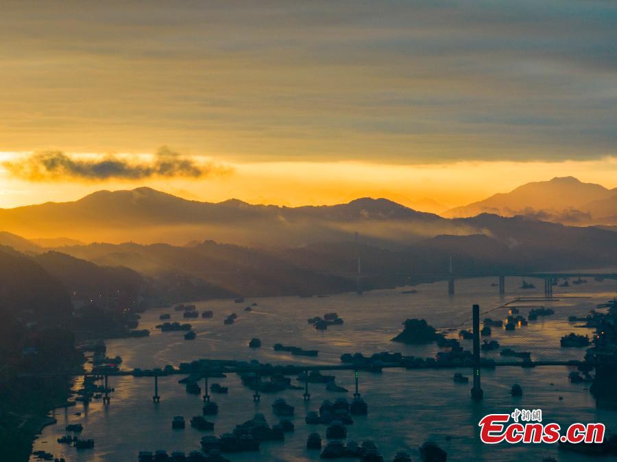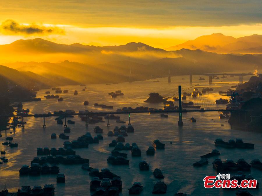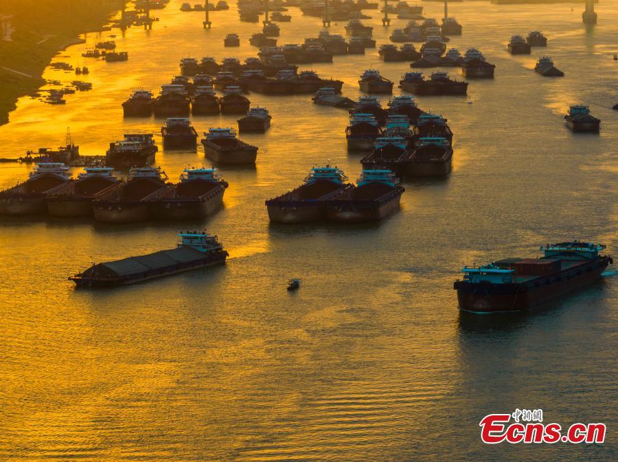 Cargo ships sail on Xijiang River under the shining morning glow, creating a golden scenery in Wuzhou, south China's Guangxi Zhuang Autonomous Region, Aug. 8, 2023. (Photo: China News Service/He Wenhua)