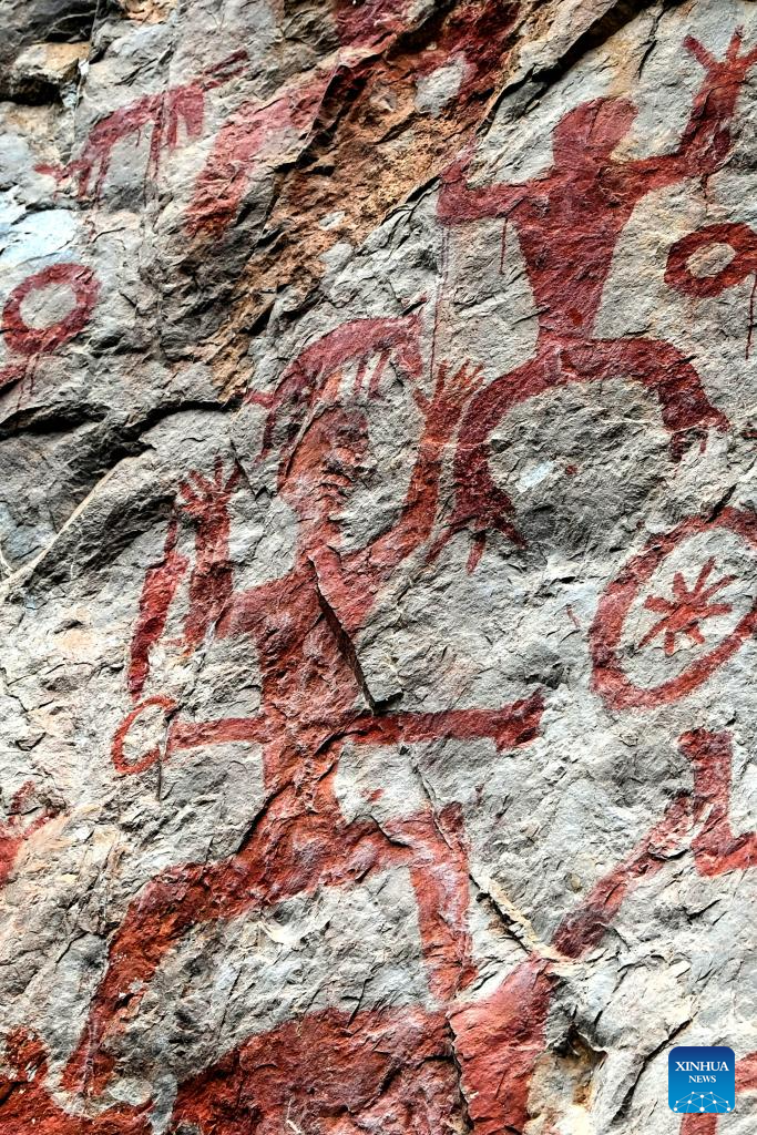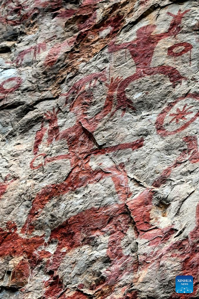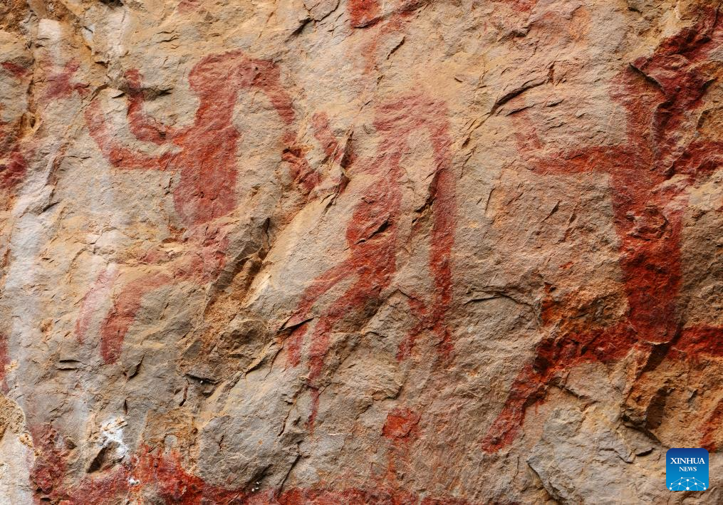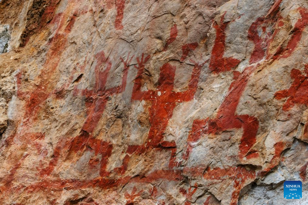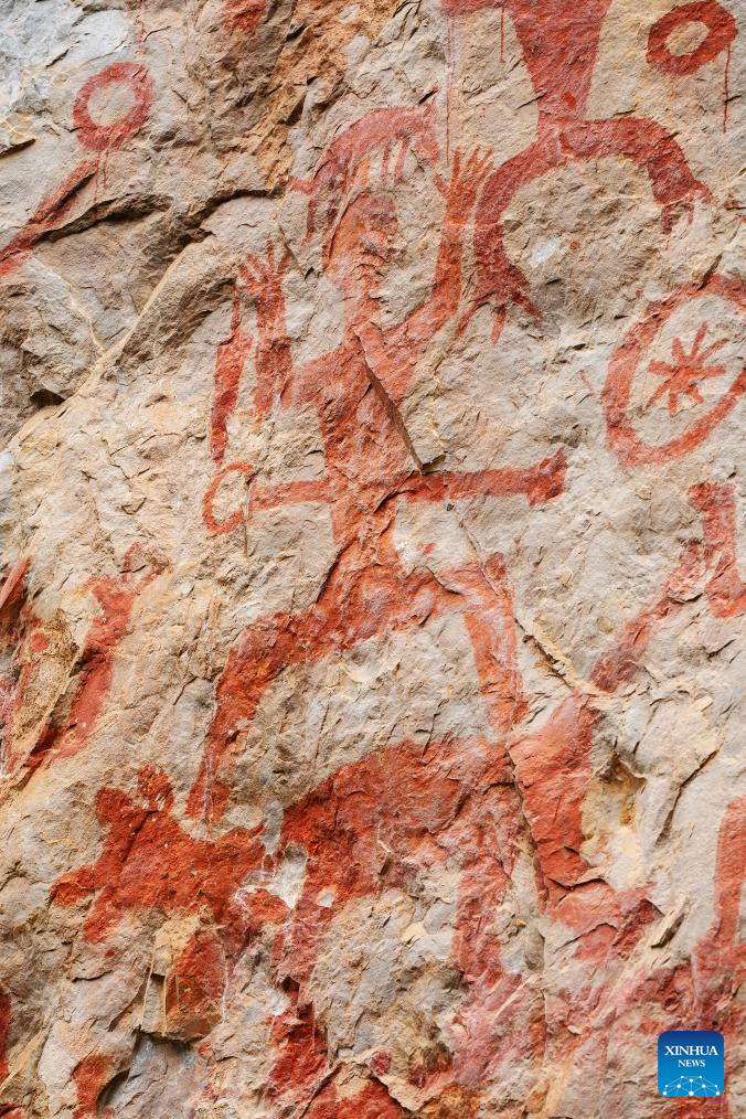 The brownish red paintings, created from the Warring States Period (475-221 BC) to East Han Dynasty (25-220), depict the sacrifices of the Luoyue people, ancestors of today's Zhuang ethnic minority.