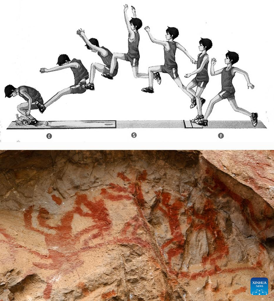 This combo photo shows a diagram (above) of the movements of jumping and a Huashan rock painting depicting jumping (photo taken by Xinhua photographer Fei Maohua on Aug. 8, 2023) in Ningming County, Chongzuo City, south China's Guangxi Zhuang Autonomous Region. (Xinhua)
