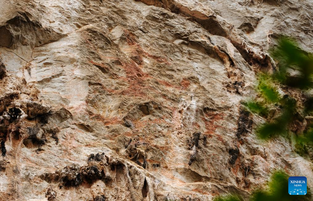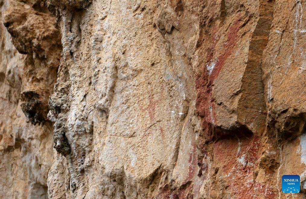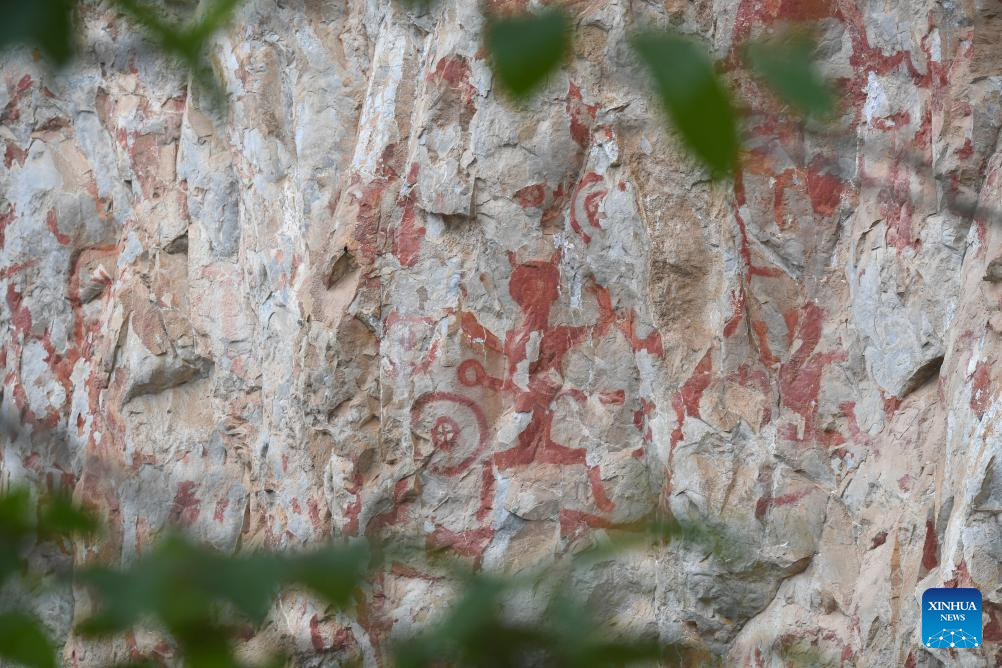 This photo taken on Aug. 8, 2023 shows a part of Huashan rock paintings in Ningming County, Chongzuo City, south China's Guangxi Zhuang Autonomous Region. (Xinhua/Zhou Hua)