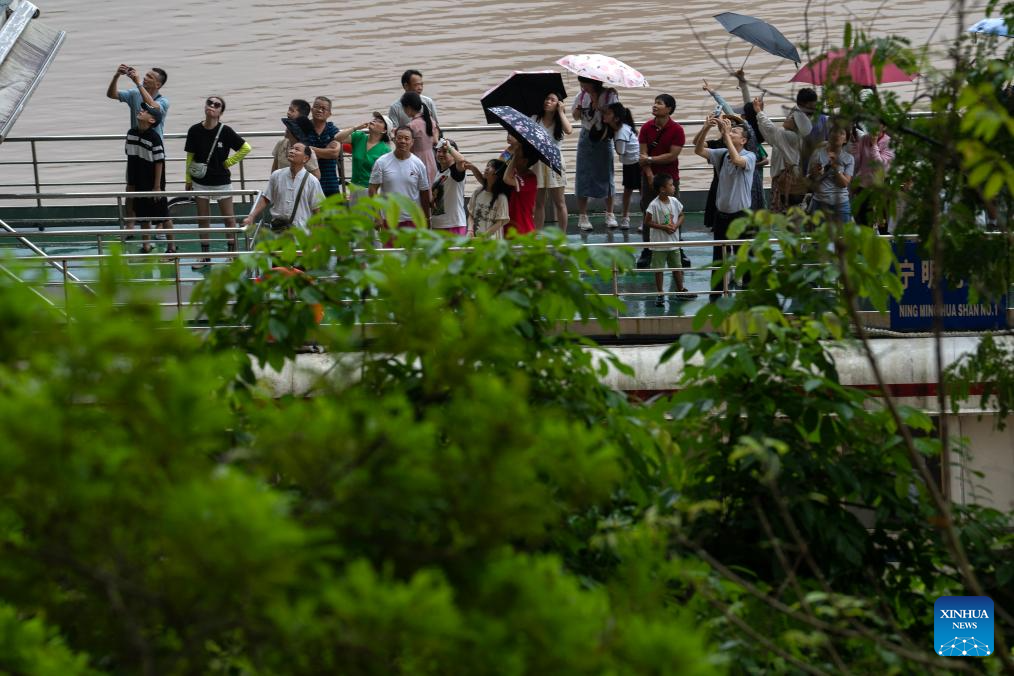 Tourists look at Huashan rock paintings in Ningming County, Chongzuo City, south China's Guangxi Zhuang Autonomous Region, Aug. 8, 2023. (Xinhua/Fei Maohua)
