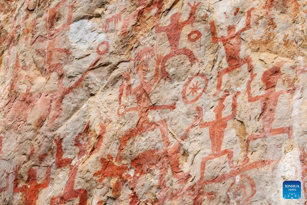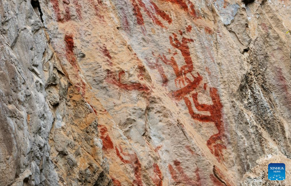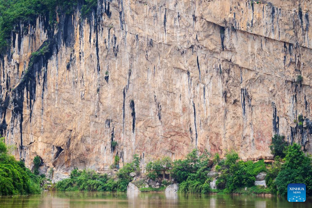 This photo taken on Aug. 8, 2023 shows Huashan rock paintings in Ningming County, Chongzuo City, south China's Guangxi Zhuang Autonomous Region. (Xinhua/Fei Maohua)