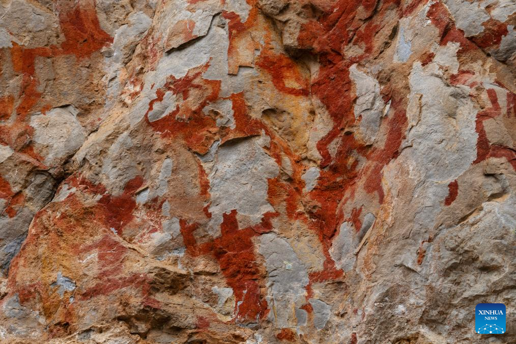 This photo taken on Aug. 8, 2023 shows a part of Huashan rock paintings in Ningming County, Chongzuo City, south China's Guangxi Zhuang Autonomous Region. (Xinhua/Zhang Ailin)