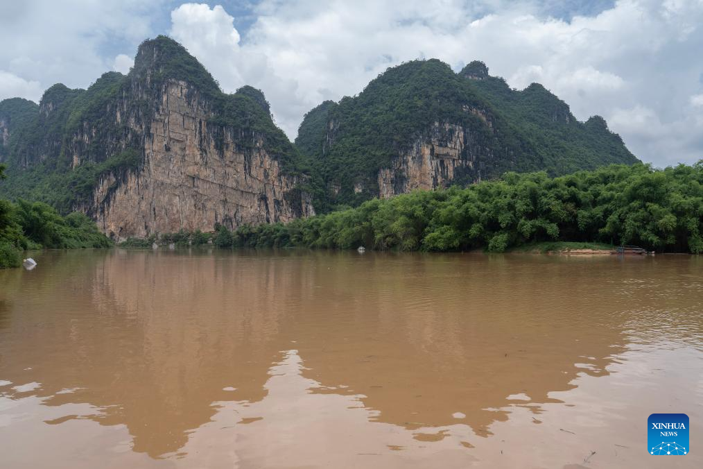This photo taken on Aug. 8, 2023 shows Huashan mountains (L) in Chongzuo City, south China's Guangxi Zhuang Autonomous Region. (Xinhua/Fei Maohua)