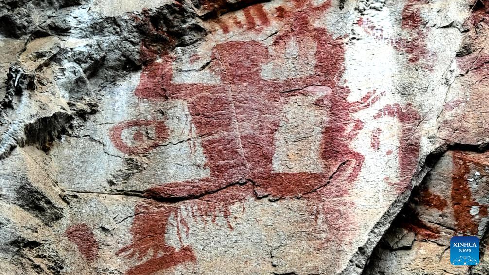 This photo taken on Aug. 8, 2023 shows a rock painting with a height of 3.58 meters, the biggest one of Huashan rock paintings, in Ningming County, Chongzuo City, south China's Guangxi Zhuang Autonomous Region. (Xinhua/Fei Maohua)