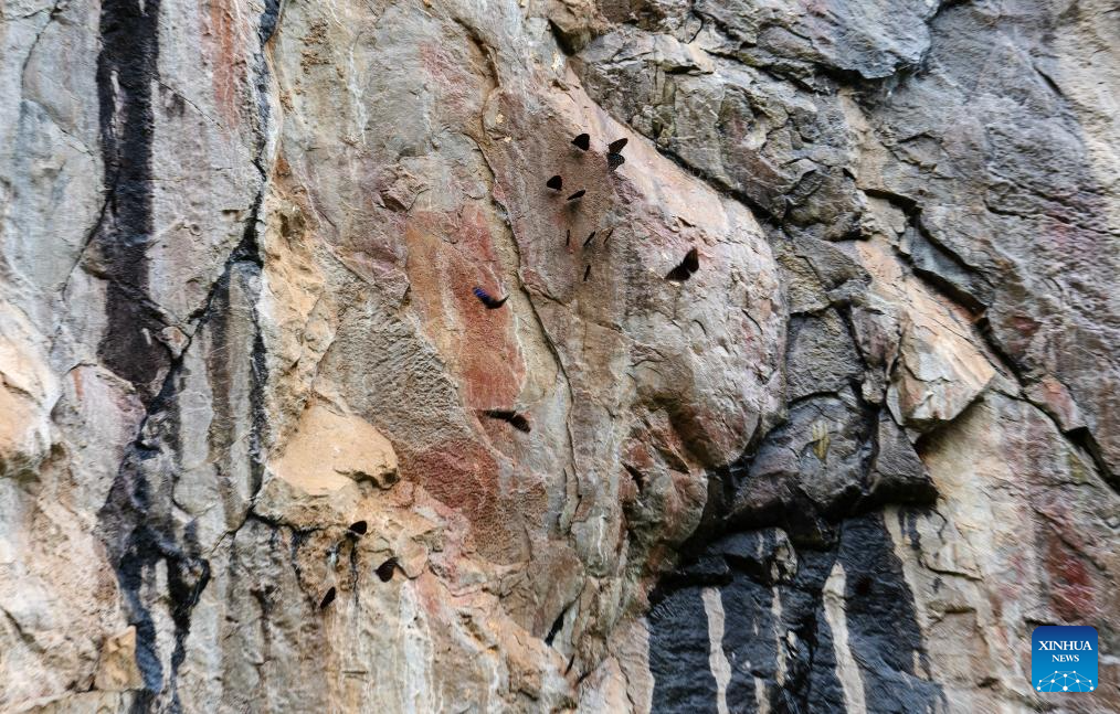 This photo taken on Aug. 8, 2023 shows butterflies on Huashan rock paintings in Ningming County, Chongzuo City, south China's Guangxi Zhuang Autonomous Region. (Xinhua/Fei Maohua)