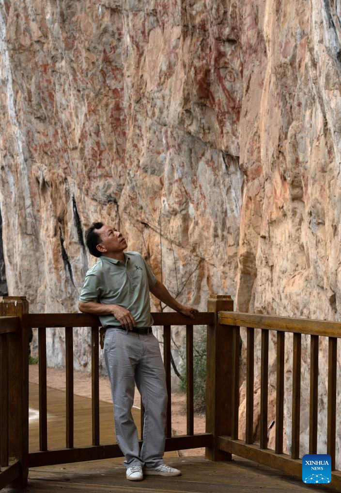 Zhu Qiuping, a cultural relics protection expert, contemplates Huashan rock paintings in Ningming County, Chongzuo City, south China's Guangxi Zhuang Autonomous Region, Aug. 8, 2023. (Xinhua/Fei Maohua)