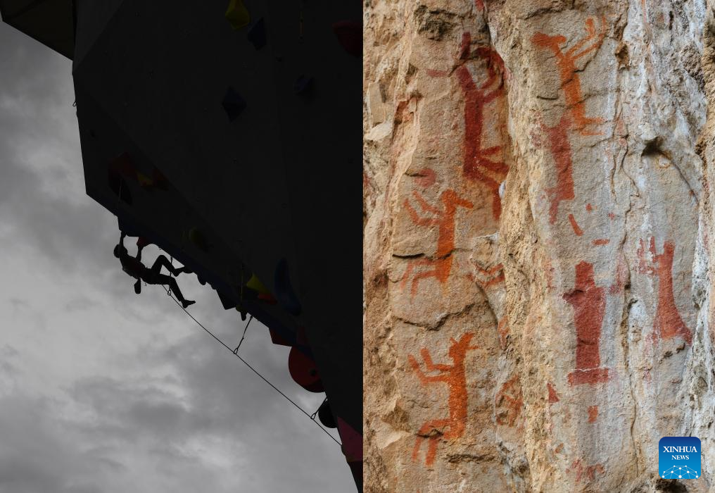 This combo photo shows a person climbing a cliff (L, file photo) and a Huashan rock painting depicting cliff climbing (photo taken by Xinhua photographer Fei Maohua on Aug. 8, 2023) in Ningming County, Chongzuo City, south China's Guangxi Zhuang Autonomous Region. (Xinhua)