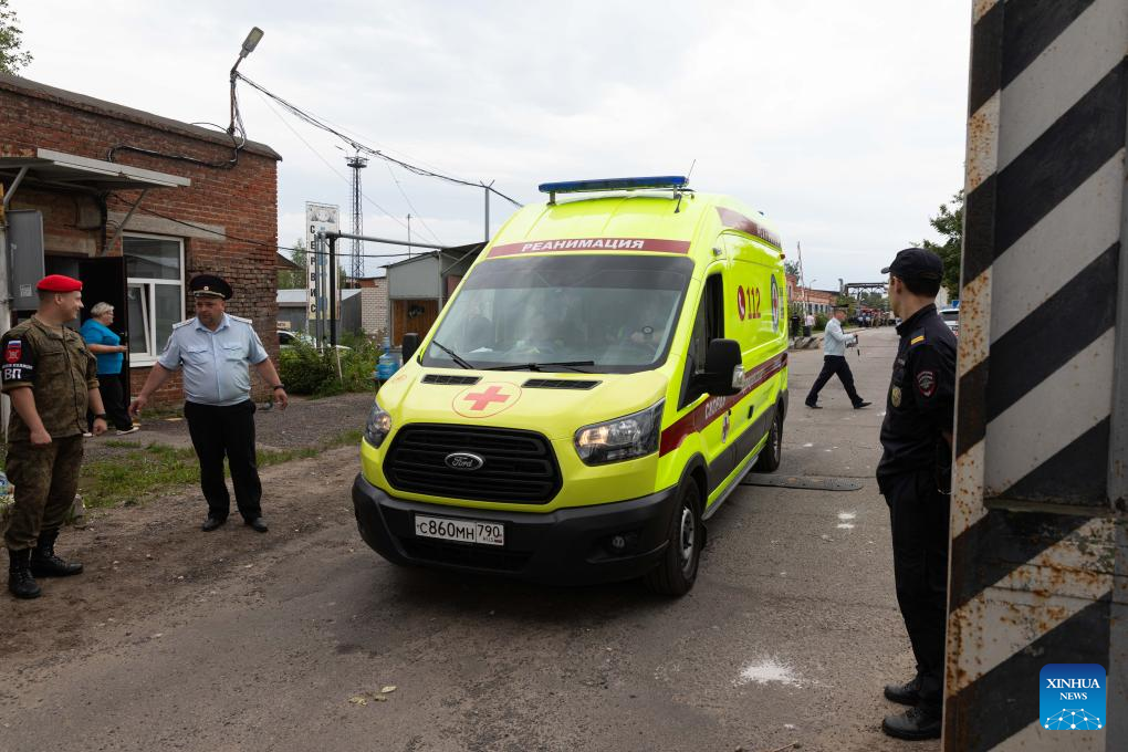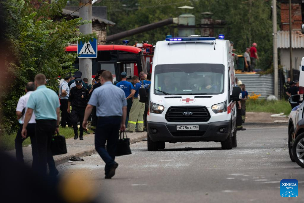 An ambulance leaves the blast site of a plant in Moscow region, Russia, Aug. 9, 2023. Forty-three people have been injured so far in a blast at an optical-mechanical plant in the city of Sergiev Posad in the Moscow region on Wednesday, local authorities said. The explosion happened on Wednesday morning at around 10:40 a.m. local time (0740 GMT) at a pyrotechnics warehouse, which was being rented out on the optical-mechanical plant's territory by a private company, said Governor of the Moscow Region Andrei Vorobiev in a Telegram post. (Xinhua/Bai Xueqi)