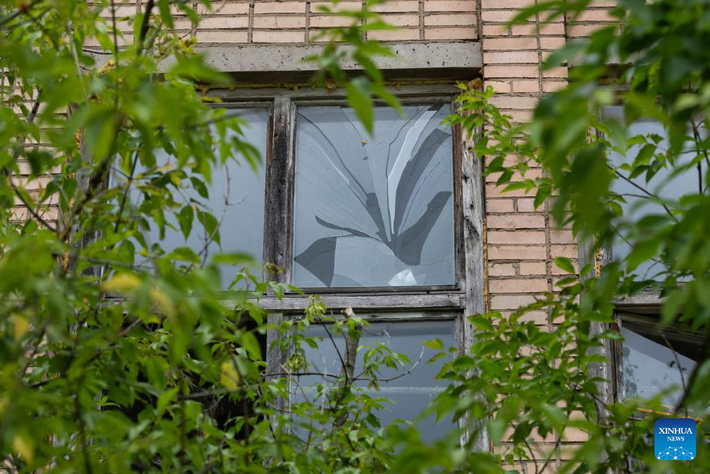 This photo shows a damaged window at the blast site of a plant in Moscow region, Russia, Aug. 9, 2023. Forty-three people have been injured so far in a blast at an optical-mechanical plant in the city of Sergiev Posad in the Moscow region on Wednesday, local authorities said. (Xinhua/Bai Xueqi)