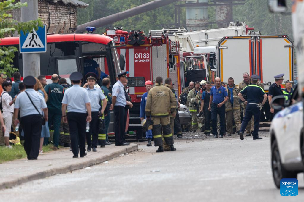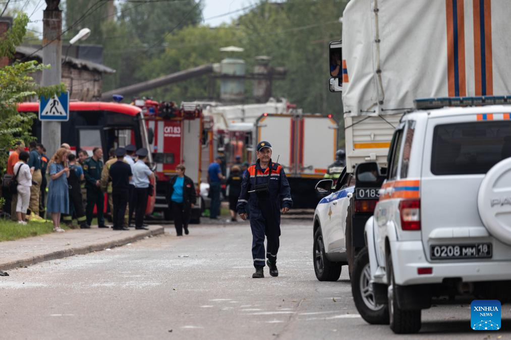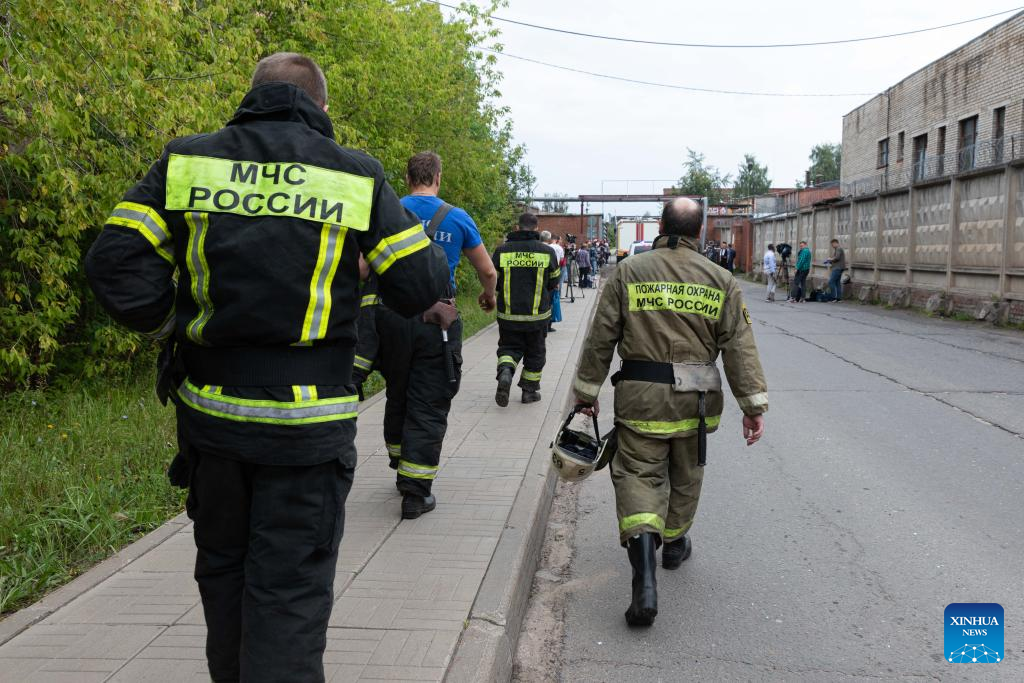 Rescuers are seen at the blast site of a plant in Moscow region, Russia, Aug. 9, 2023. Forty-three people have been injured so far in a blast at an optical-mechanical plant in the city of Sergiev Posad in the Moscow region on Wednesday, local authorities said. (Xinhua/Bai Xueqi)