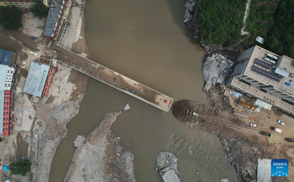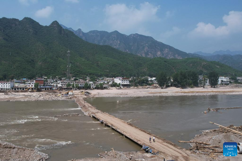 This aerial photo taken on Aug. 9, 2023 shows villagers walking on a bridge leading to Shangzhuang Village of Sanpo Town, Laishui County, north China's Hebei Province. Some roads blocked by the rain-triggered floods in the county are repaired, and electricity and communication services are restored. (Xinhua/Yang Shiyao)