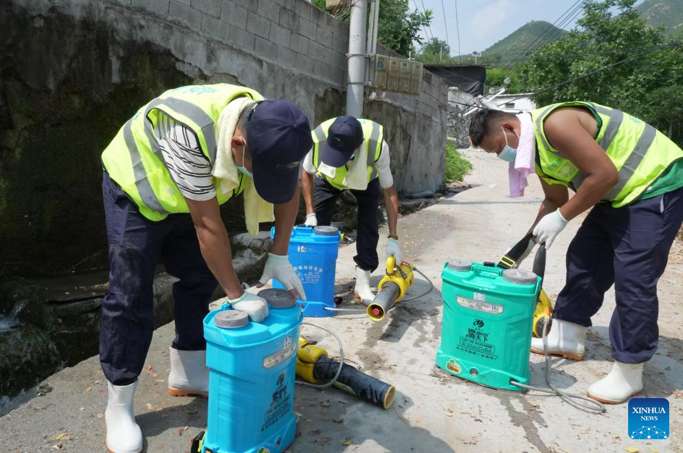People prepare to conduct disinfection in Nanzhuang Village of Jiulong Town, Laishui County, north China's Hebei Province, Aug. 9, 2023. Some villages in Laishui County encountered traffic and communication disruptions caused by the recent heavy rainfall brought by Typhoon Doksuri. At present, the local authorities is conducting environmental disinfection to prevent epidemics after the floods. (Xinhua/Yang Shiyao)