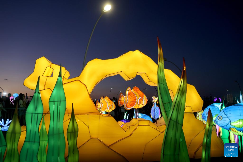 People visit the Chinese Lantern Exhibition in Tel Aviv, Israel, on Aug. 9, 2023. The Chinese Lantern Exhibition in Tel Aviv features several sets of lanterns which are crafted by a team from Zigong City of southwest China's Sichuan Province. (Xinhua/Chen Junqing)