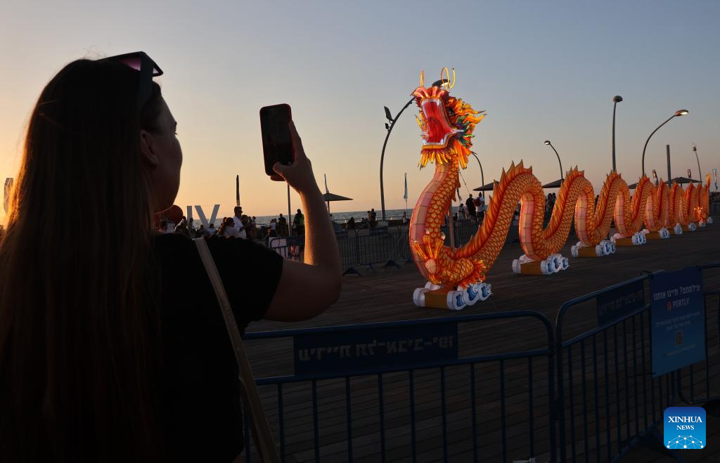 A visitor takes photos at the Chinese Lantern Exhibition in Tel Aviv, Israel, on Aug. 9, 2023. The Chinese Lantern Exhibition in Tel Aviv features several sets of lanterns which are crafted by a team from Zigong City of southwest China's Sichuan Province. (Photo by Gil Cohen Magen/Xinhua)