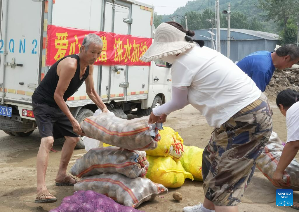 Villagers transfer donated vegetables in Ligezhuang Village of Zhaogezhuang Town, Laishui County, north China's Hebei Province, Aug. 10, 2023. Affected by heavy rainfall, some villages in Laishui County encountered traffic and communication disruptions. Local authorities have made every effort in mending infrastructure damaged by flood while delivering disaster relief supplies purchased by the government and donated by all walks of life to flood-affected residents. (Xinhua/Yang Shiyao)