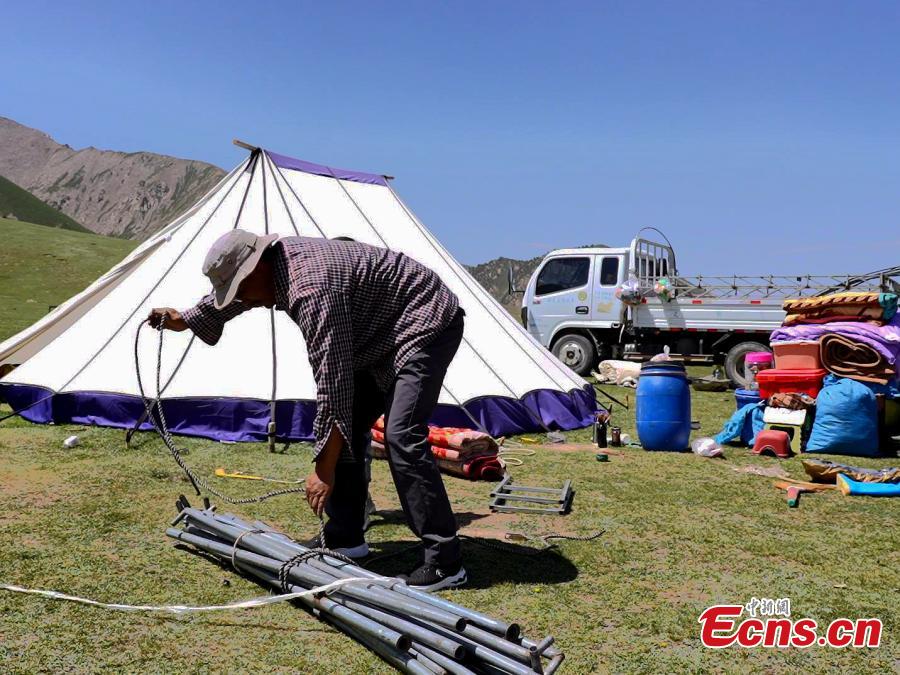 A herder sets up a tent on the way to summer pasture in Dulan County of Haixi Mongolian-Tibetan Autonomous Prefecture, northwest China's Qinghai Province. (Photo: China News Service/Mo Jiayin)