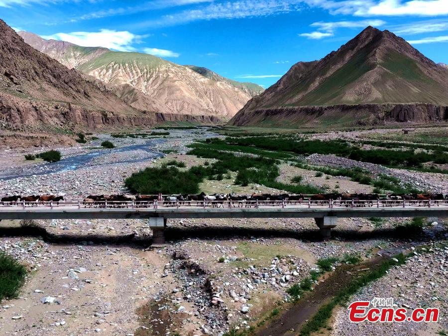 Livestock are on their way to summer pasture in Dulan County of Haixi Mongolian-Tibetan Autonomous Prefecture, northwest China's Qinghai Province. (Photo: China News Service/Mo Jiayin)
