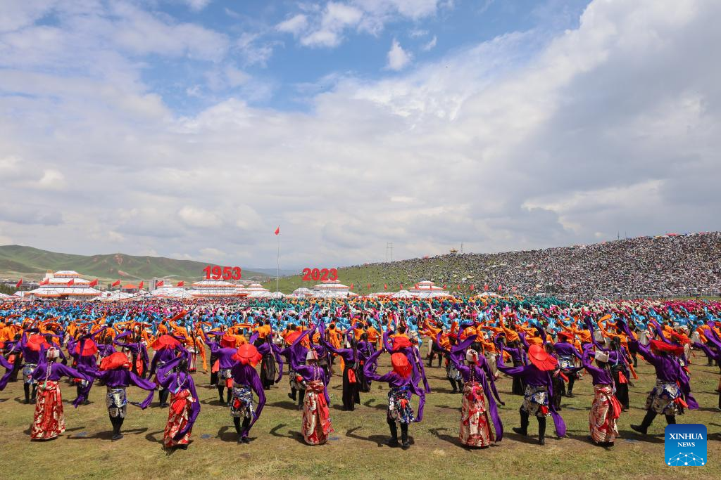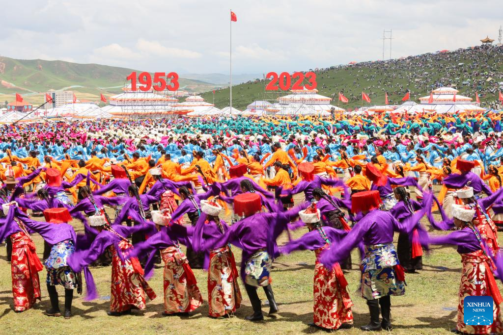 Dancers perform during a celebration event marking the 70th anniversary of the founding of Gannan Tibetan Autonomous Prefecture in Hezuo City, northwest China's Gansu Province, Aug. 10, 2023. A celebration event was held here to mark the 70th anniversary of the founding of Gannan Tibetan Autonomous Prefecture. (Xinhua/Ma Xiping)