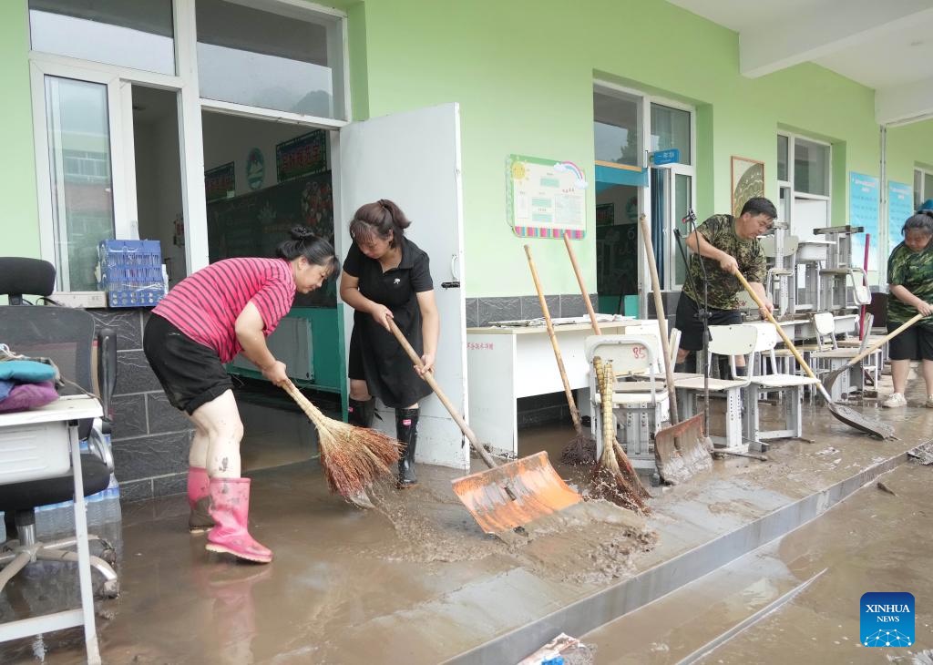Teachers clean up sludge at a school in Qizhongkou Town of Laishui County, north China's Hebei Province, Aug. 11, 2023. Some schools, located in the mountainous areas of Laishui County, have carried out post-flood recovery work recently. Relevant personnel have investigated schools thoroughly for potential safety hazards, cleaned campuses and carried out disinfection for epidemic prevention and control. (Xinhua/Wang Kun)
