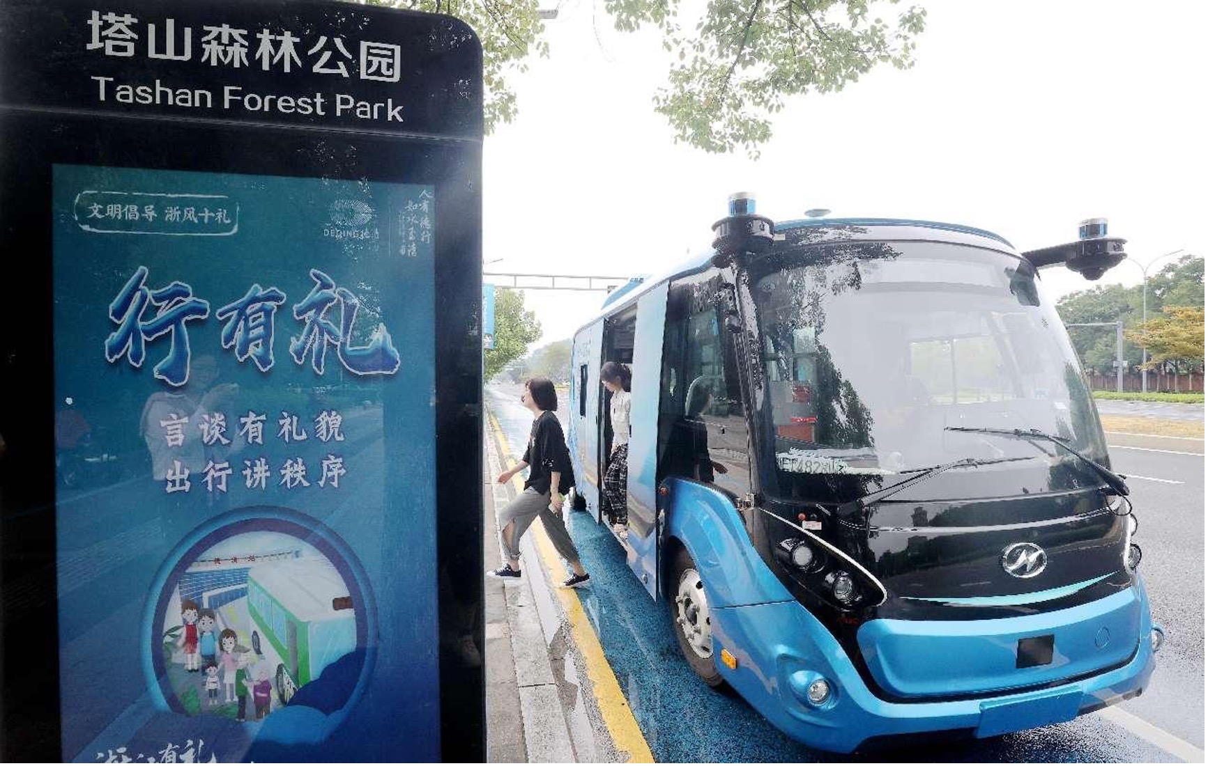 Passengers get off a self-driving bus in Deqing county, Huzhou city, east China's Zhejiang province. (People's Daily Online/Xie Shangguo)