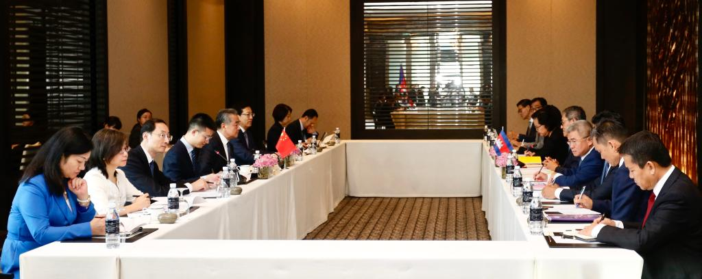 Chinese Foreign Minister Wang Yi (5th L), who is also a member of the Political Bureau of the Communist Party of China Central Committee, meets with Sok Chenda Sophea (5th R), Cambodian deputy prime minister and foreign minister-designate, minister delegate attached to the Cambodian prime minister, in Phnom Penh, Cambodia, on Aug. 12, 2023. (Photo by Ly Lay/Xinhua)