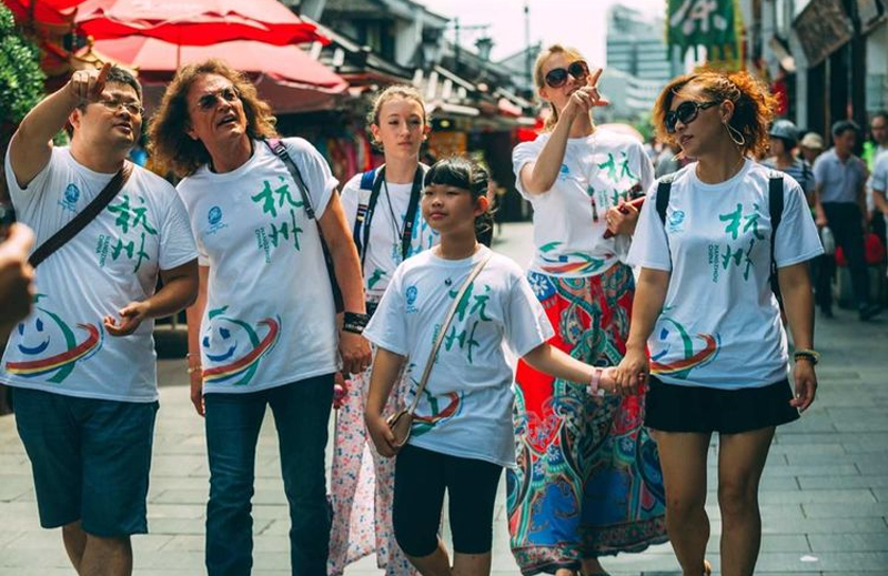 A photo shows Zhou Zhen introducing Hangzhou to foreign visitors. (Photo provided by the interviewee)