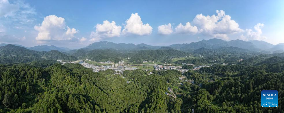 This aerial panoramic photo taken on Aug. 12, 2023 shows a view at Tiantangzhai management station in Anhui Tianma National Nature Reserve, east China's Anhui Province. (Xinhua/Huang Bohan)