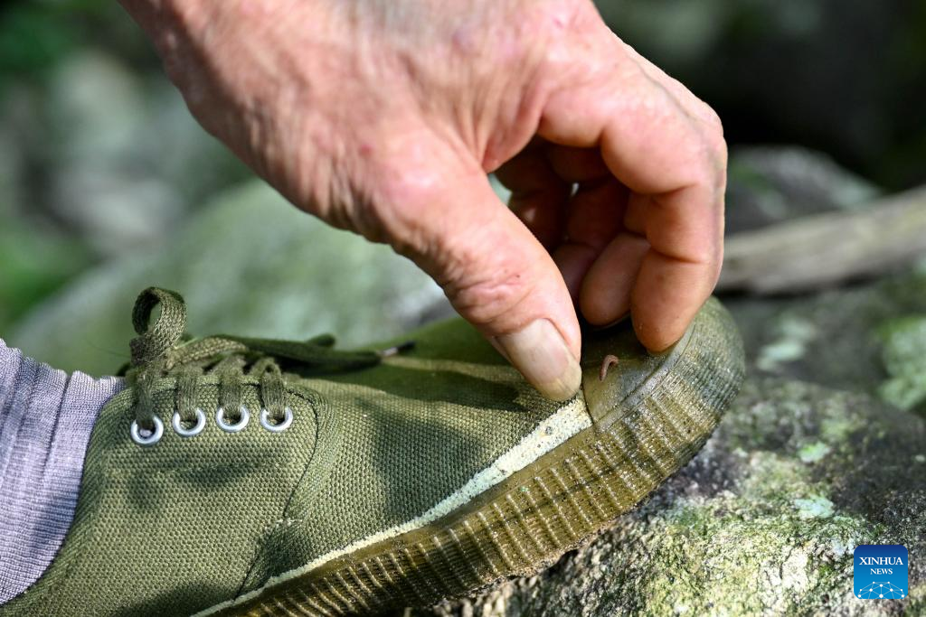 Wang Kedong takes off a leech from his shoe at Tiantangzhai management station in Anhui Tianma National Nature Reserve, east China's Anhui Province, Aug. 12, 2023. (Xinhua/Huang Bohan)