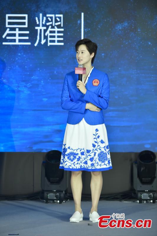 An athlete models the women's official Team China opening ceremony parade uniforms for the upcoming Hangzhou Asian Games in Beijing, Aug. 15, 2023. (Photo: China News Network/Li Jun)