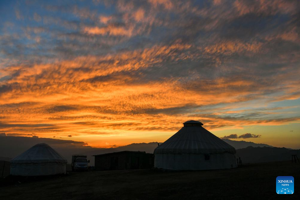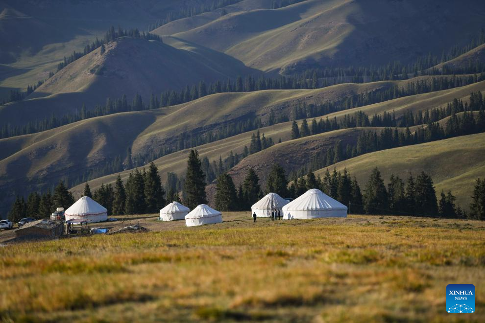 This photo shows tourists at a homestay at Solbastiao alpine pasture in the Tianshan Mountains area in Miaoergou Township of Changji, northwest China's Xinjiang Uygur Autonomous Region, Aug. 13, 2023. (Xinhua/Hu Huhu)