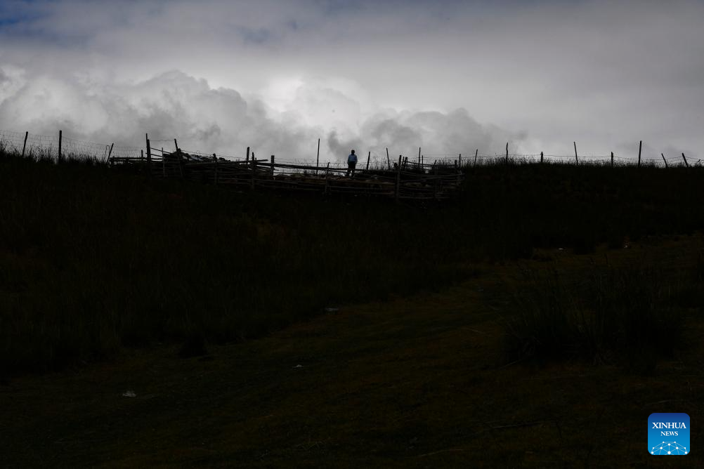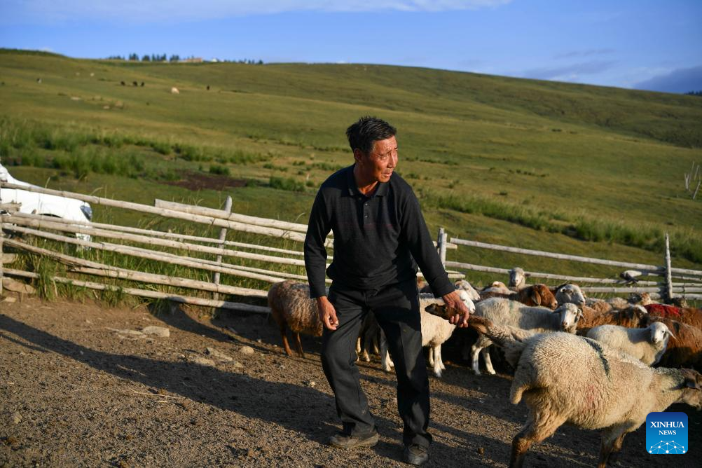 A herder is ready to put his herd out to pasture at Solbastiao alpine pasture in the Tianshan Mountains area in Miaoergou Township of Changji, northwest China's Xinjiang Uygur Autonomous Region, Aug. 14, 2023. (Xinhua/Hu Huhu)